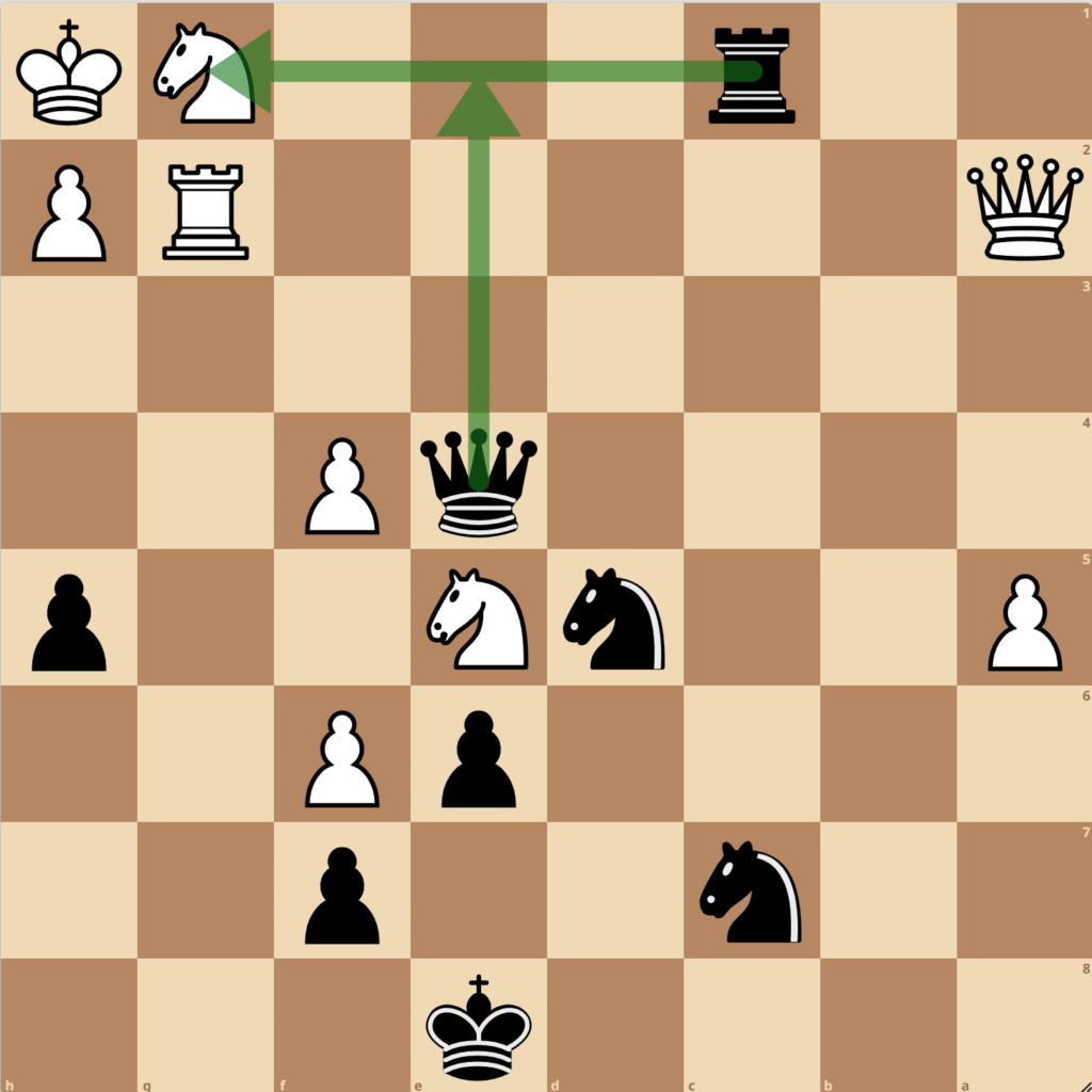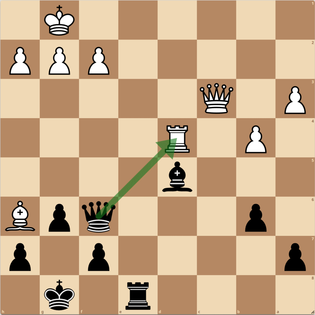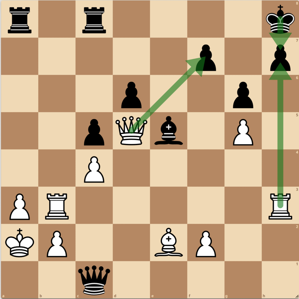 If we have extra pieces to help our Queen, it may be a strong move to sacrifice a piece if the K will be exposed afterwards. But make sure you have a good follow-up to your sacrifice or you may just lose your piece for nothing! Here we sacrifice our rook with Rxh7!! and afterwards Qxf7 will be a check. If they block with their bishop the h file is now open and the rook next to our king will come across and finish the checkmate.