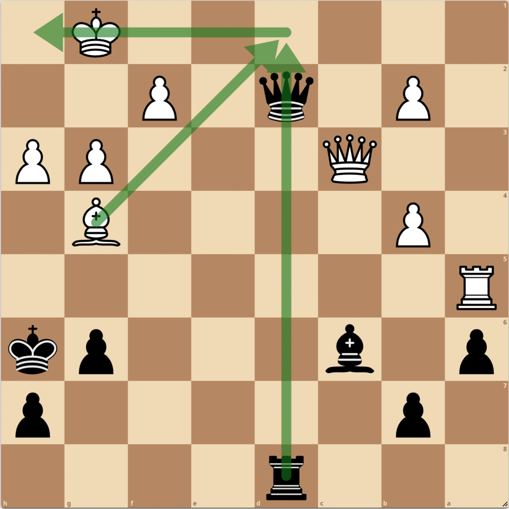 This is a common checkmate pattern whenever we control the diagonal leading in to our opponent’s castled king. If we can get a rook or a queen into the corner square then it will be checkmate. Here we can sacrifice our queen to get our rook into the corner square.